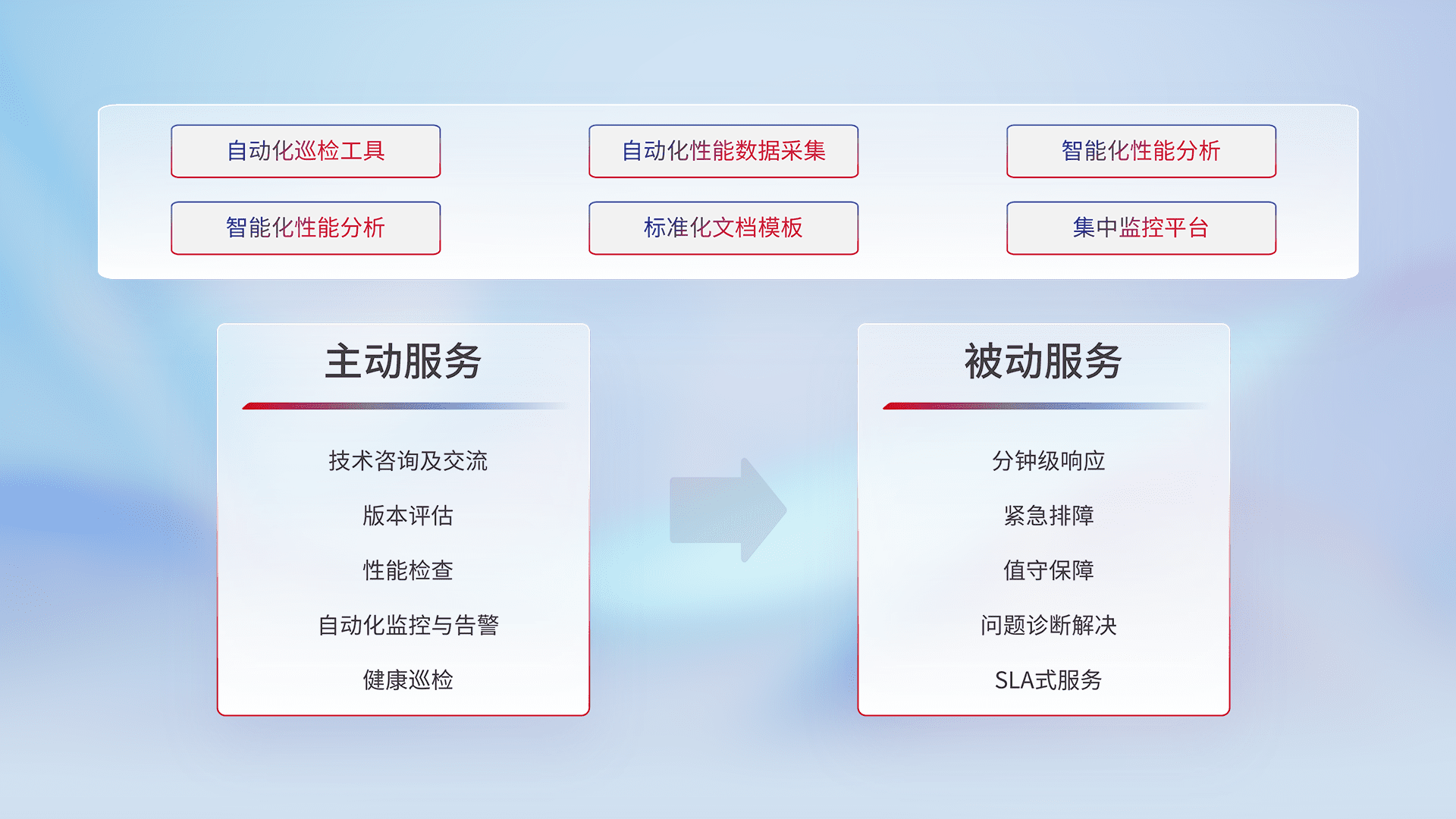 智能化工具和标准化文档,,,保障服务质量,,,提供主动服务(包含技术咨询、、版本评估、、、性能检查、、、、自动化监控与告警、、、健康巡检)和被动服务包含(分钟级响应、、紧急排障、、、、值守保障、、问题诊断解决、、、、SLA服务)。。。